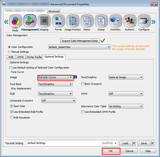 • supplementary explanationIf Use Default Setting of Selected Color Configuration under Optional Settings is checked, remove the check. If this is checked, tone curve cannot be selected.