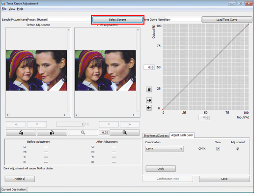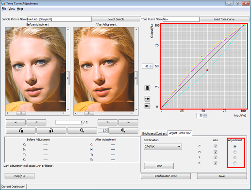 7. Under Adjustment, select the radio buttons of the colors that you want to adjust (C/M/Y/K). Click on the tone curve and drag the displayed handle (operating point) to adjust the tone curve.