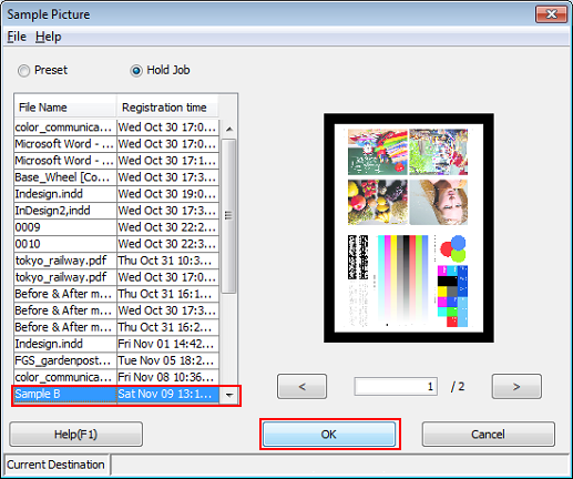 5. Select the file name for the temporarily saved job and click OK.