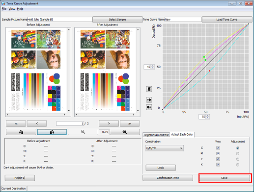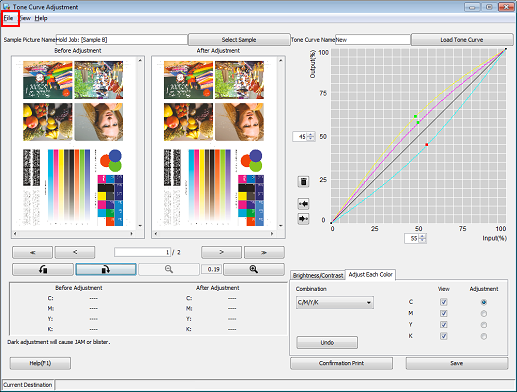 The adjusted tone curve can be registered in the image controller and called to be applied when printing.