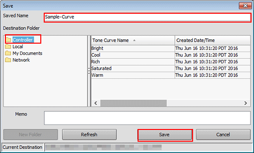 9. Enter the name of the adjusted tone curve. Select Controller as the Destination Folder and click Save.
