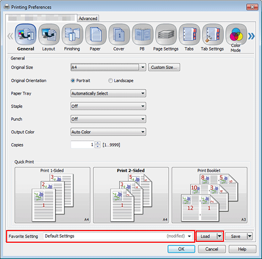 3. Select Default Settings for Favorite Setting and click Load.