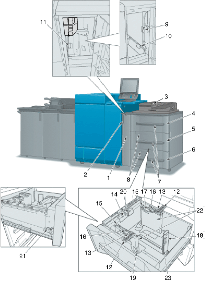 Holds 1,850 sheets (80 g/m2 / 21 lb Bond) of standard, custom, or tab paper sizes. Load paper of the weight from 52 g/m2 to 400 g/m2 / 14 lb Bond to 106 lb Bond. All types of paper can be loaded.