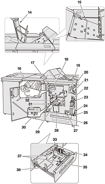 29 | Knob [PB8] | Turned clockwise for removal of cover paper from the binding unit when paper jams. |