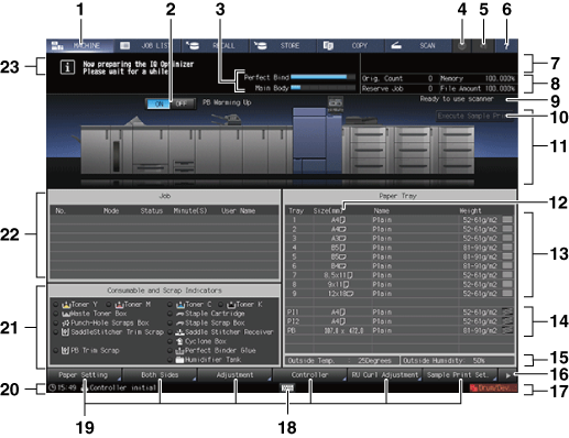 19 | Machine function keys display area | Paper Setting: Specifies the paper conditions for Paper Feed Unit PF-707m, Paper Feed Unit PF-711, the upper tray/lower tray of Post Inserter PI-502, the upper tray/lower tray of Post Inserter mounted on Folding Unit FD-503, and the cover tray of Perfect Binder PB-503. Both Sides: Makes adjustments for images printed on the front and back sides of paper loaded into each tray (tray 1 to tray 9), as well as for rotation/skew adjustment, chart adjustment, gap adjustment, and scan measurement adjustment. Adjustment: Adjusts the main body and optional equipment. Controller: Configures the controller. RU Curl Adjustment: Performs curl adjustment for each tray (tray 1 to tray 9). When Humidifier HM-101 is mounted on Relay Unit RU-511, you can make the humidification setting for each tray. Sample Print Set: Pressed to set sample print. The following buttons are displayed when the Machine function keys switch is pressed. Color Density Manual Control: Press this key to manually adjust the color density or manage the registered information for Color Density Manual Control. When Use Color Density Control is set to ON, this key is enabled. Color Density Control Result: Press this key to check the periodic adjustment result of Color Density Control. When the periodic adjustment is conducted, this key is enabled. Register/Delete Paper Setting: Press this key to register or delete the frequently used paper setting. |