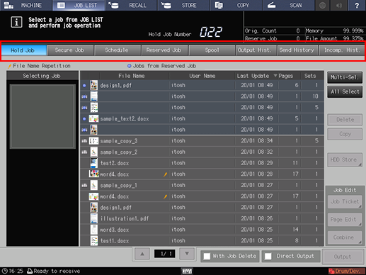Displayed when Hold Job is pressed on the JOB LIST screen. It allows you to output, duplicate, or delete hold jobs and provides HDD Store and Job Edit functions.