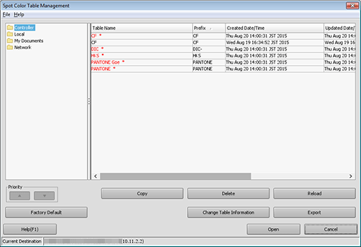 When Controller is selected on the tree view, the list is displayed per group of spot color tables with the same Prefix. Within the group, displays in order of priority. You can change the order of priority. For details about how to change the order of priority, refer to Changing the priority.