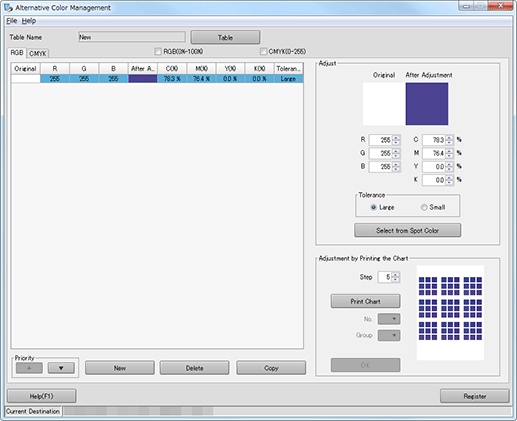 You can duplicate the alternative color settings displayed on the Alternative Color Management screen within the same alternative color table. When you adjust the alternative color using the existed alternative color setting, original settings of the alternative color is overwritten. When you want to save the current settings, make the duplication of it.