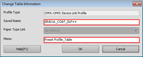 • supplementary explanationBut, you cannot change the table name of the CMYK-CMYK device link profile which was registered at factory shipping.