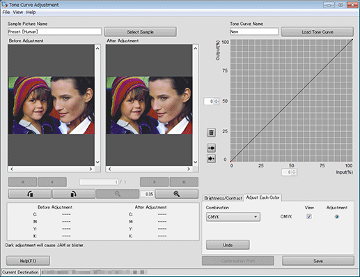 To display this screen, click Tone Curve Adjustment on the Color Centro screen. To close this screen, select Close from File menu.