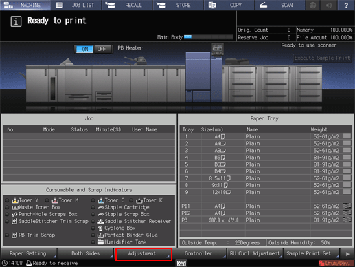 1. On the touch panel of the main body, press Adjustment on the MACHINE screen.