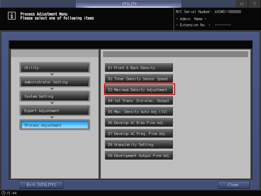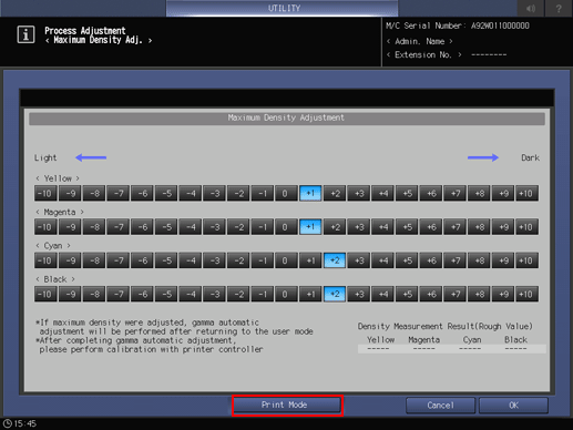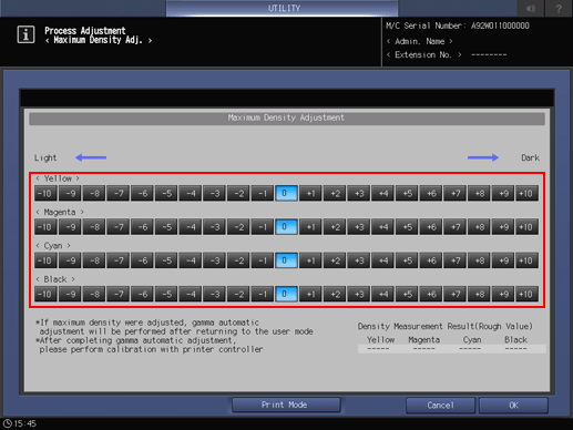 Density Measurement Result is displayed in the lower right of the Maximum Density Adjustment screen.