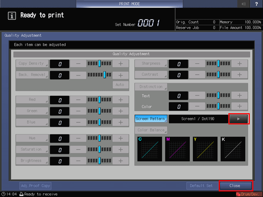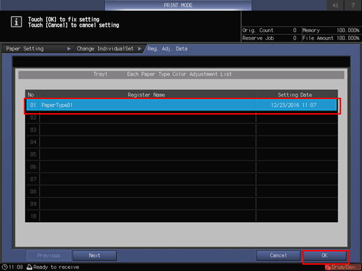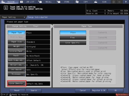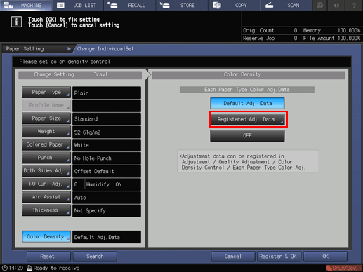 Select the tray to which the adjusted color density is applied, and press Change Set.