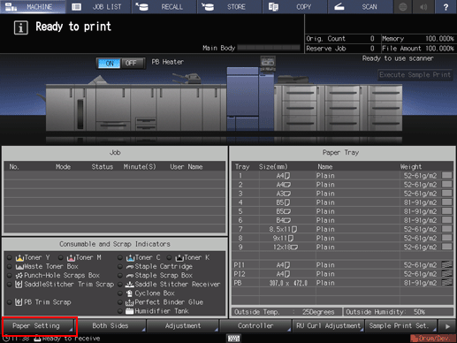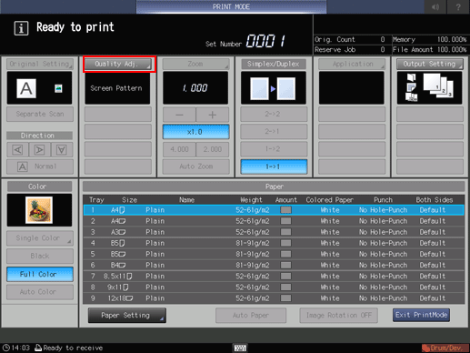 supplementary explanationTo set the output tray, press Output Setting at the upper right of the PRINT MODE screen.