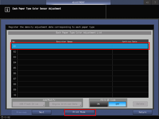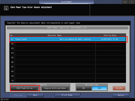 You can register the measured data (color density value for each paper type) saved in the USB memory or the computer on the network into the machine.