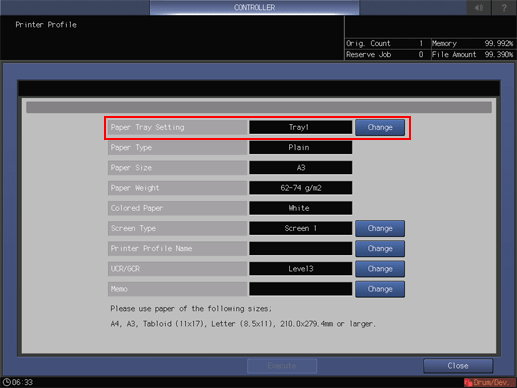 4. Press Change of Paper Tray Setting, and then select a tray.