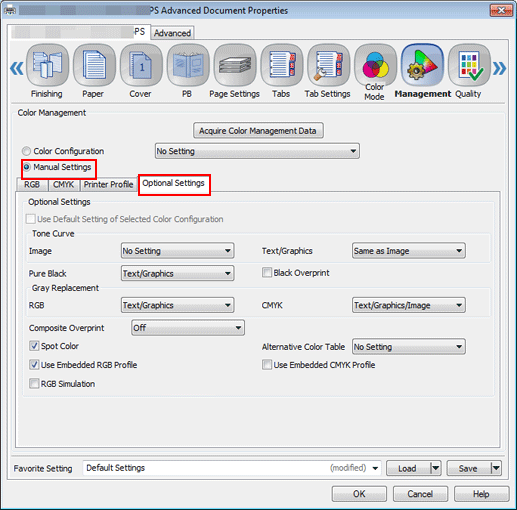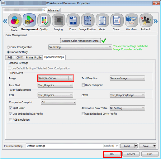 • supplementary explanationIf Use Default Setting of Selected Color Configuration under Optional Settings is checked, remove the check. If this is checked, tone curve cannot be selected.