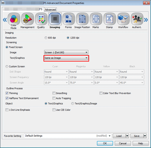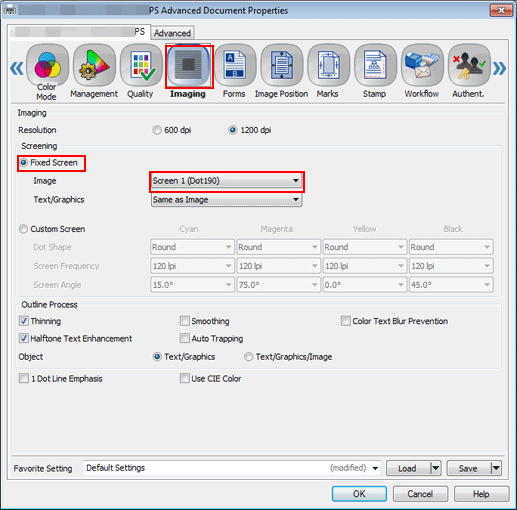 supplementary explanationSelecting Custom Screen allows you to access advanced settings: dot shape, screen line count, and screen angle. (Refer to [Custom Screen].)