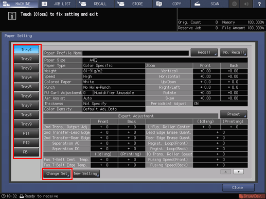 11. Select the tray in which the paper to be adjusted has been loaded, then press Change Set.