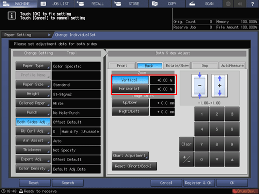 If the interval of the image on the front side is different from that of the image on the back side, enter the adjustment value in Vertical (crosswise direction) and Horizontal (feed direction) on the Back screen.