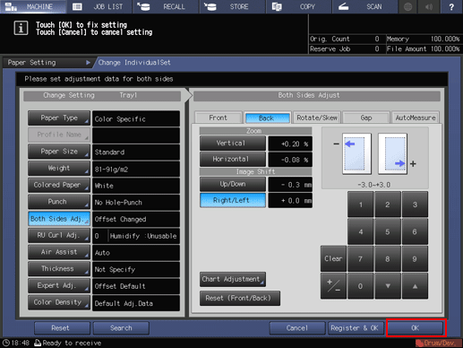 If the position of the image on the front side is different from that of the image on the back side, enter the adjustment value in Up/Down (crosswise direction) and Right/Left (feed direction).