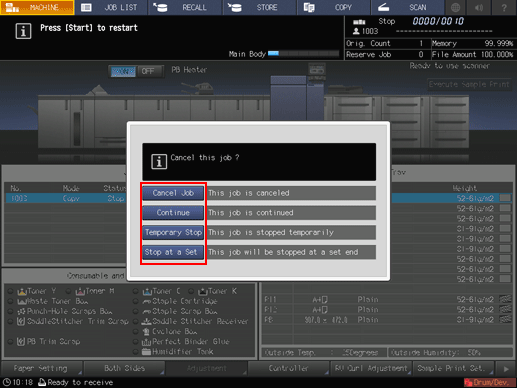 • supplementary explanationPress Stop at a Set to suspend the job when a set currently output is completed. Press Start on the control panel to resume the job. Stop at a Set is displayed when Image Controller IC-604 is mounted.