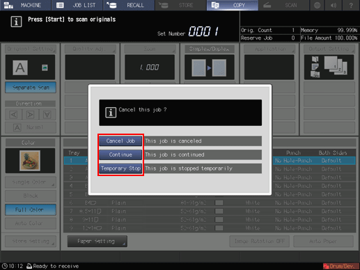 • supplementary explanationPress Temporary Stop to suspend the job. When the job is suspended, some settings can be changed. Press Start on the control panel to resume the job.