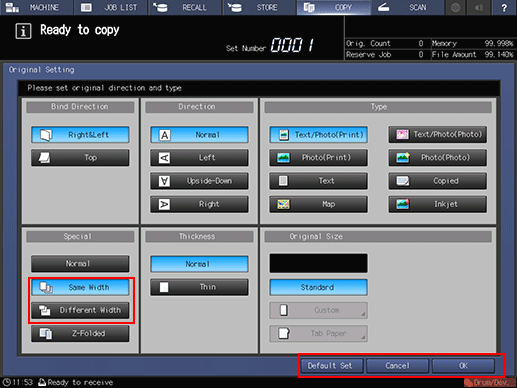If you load an original with different-width and -size pages on the ADF and select Same Width, it may cause the original to become creased or edge-folded. Select the appropriate option to suit the type of mixed-size original.