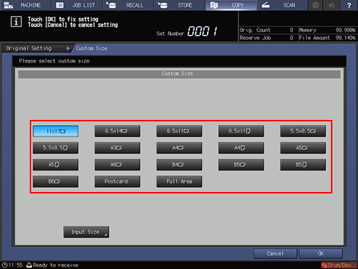 supplementary explanationTo display the Input Custom Size screen, press Input Size.