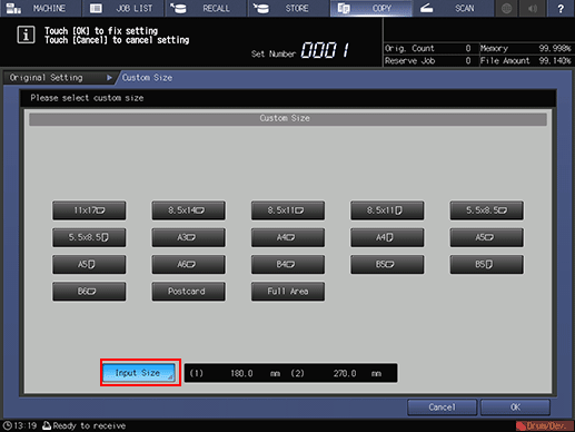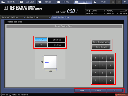 supplementary explanationPress the key (1) indicating the widthwise dimension, or (2) indicating the lengthwise dimension. Use the touch panel keypad or downup to enter the desired value. Available input range is from 100 mm to 297.0 mm / 3.940" to 11.690" in widthwise dimension, and from 140 mm to 431.8 mm / 5.515" to 17.000" in lengthwise dimension.