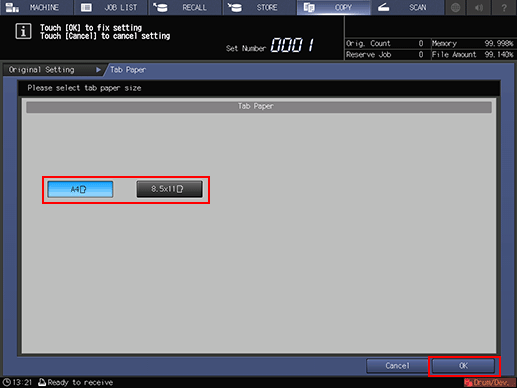 preconditionFor copying the tab part, Paper Setting in addition to Original Setting are required. Specify tab paper to the tray in Paper Setting. For details, refer to Setting Paper in a Paper Tray.