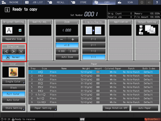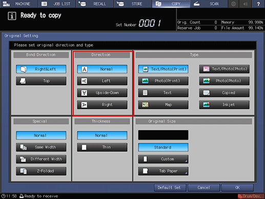 supplementary explanationThis setting is also available from the Direction area of the Original Setting screen. To display the Original Setting screen, press Original Setting on the COPY screen.