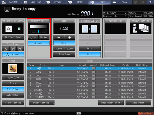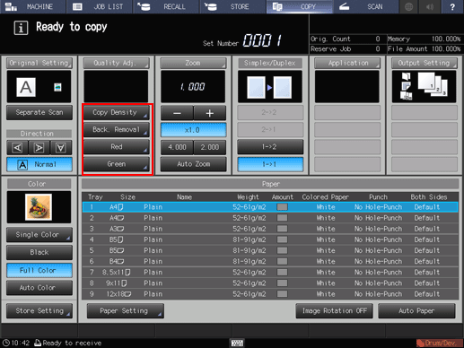 Up to 4 shortcut keys for frequently-used adjustment items can be displayed under Quality Adj. on the COPY screen. These keys allow you to directly jump to the adjustment screen for each. The setting of shortcut keys can be made from User Setting in the Utility menu.