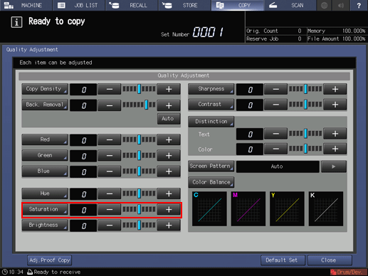 The screen returns to the COPY screen. The Saturation indication can be found under Quality Adj. on the COPY screen.