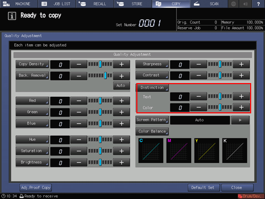 The screen returns to the COPY screen. The Image Distinction indication can be found under Quality Adj. on the COPY screen.
