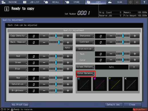 The screen returns to the COPY screen. The Color Balance indication can be found under Quality Adj. on the COPY screen.