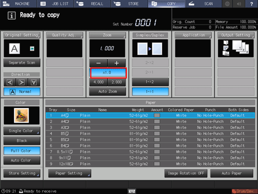 • supplementary explanationAuto Zoom or x1.0 may not be selected automatically if the initial setting has been changed. The default setting can be changed from Job Reset Setting on the UTILITY screen. For details about Job Reset Setting, refer to [Job Reset Setting].