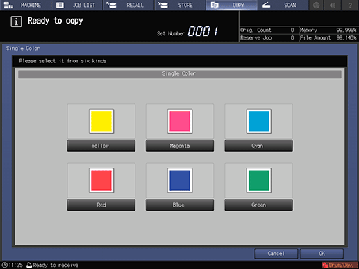 Single Color: Copy in a single color selected from 6 colors which are Yellow, Magenta, Cyan, Red, Blue, Green.