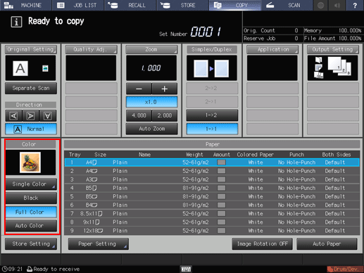 Select one from 4 modes of Single Color, Black, Full Color, or Auto Color, which are shown under Color.