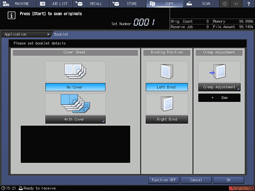 supplementary explanationTo cancel the Booklet function with the current setting saved, press Function OFF.