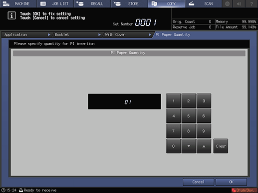 supplementary explanationWhen PI1 or PI2 is selected, Quantity is available. Display the PI Paper Quantity screen, then use the keypad on the screen or press the down or up key to enter the number of cover sheets. You can enter 1 to 40 sheets. Press OK.