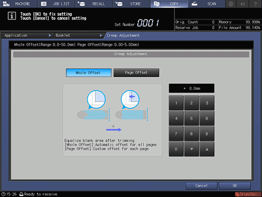 supplementary explanationDisplay the Creep Adjustment screen, and then select Whole Offset or Page Offset. Then, use the keypad on the screen or press the down or up key to enter the offset amount. Press OK.
