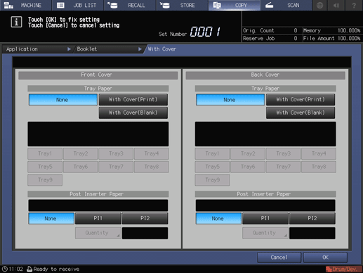 supplementary explanationWhen there is an original to be copied on the back cover, select With Cover(Print) under Back Cover. When there is a blank original on the back cover, select With Cover (Blank) under Front Cover, then select the paper tray in which a cover sheet has been loaded in step 2. If there is no original page for the back cover, select None.