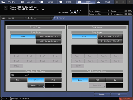 preconditionWhen using cover paper different from paper for the body sets, load the same size as the body sets into another tray. Post inserter of Folding Unit FD-503 cannot be used for feeding covers and body sets.