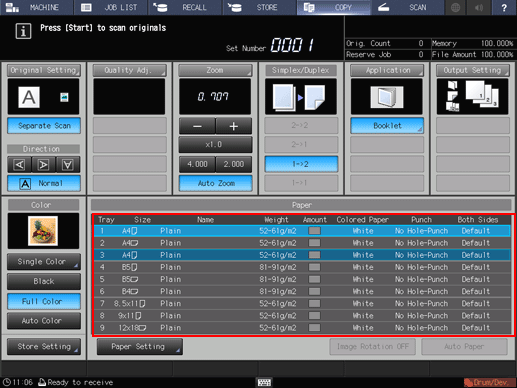 preconditionSelect a body set from the Paper list on the COPY screen. The longer side of the selected paper is divided into two parts to be printed. The Automatic Image Rotation functions as needed. Also, Auto Zoom is automatically selected.