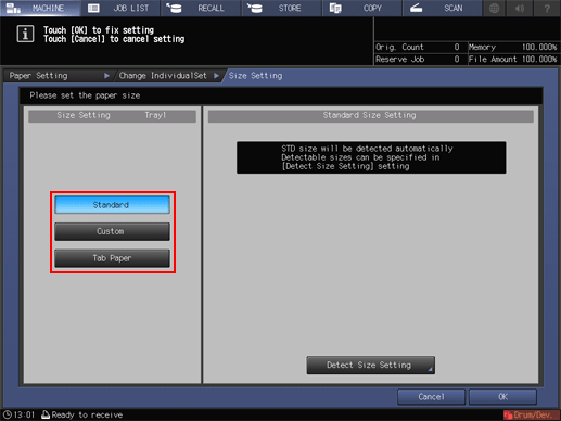 With Standard selected, the machine automatically detects the standard size when loaded with standard size paper in that tray.