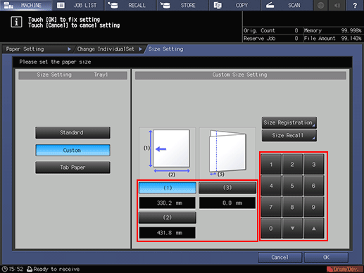 supplementary explanationAfter entering the value, press Size Registration. The Size Registration screen is displayed.