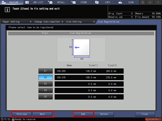 supplementary explanationPress the number key on the left side of the desired entry, then press Add. The Custom Size Name Setting screen is displayed.