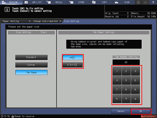 Selecting Tab Paper displays the Tab Paper Setting screen.
