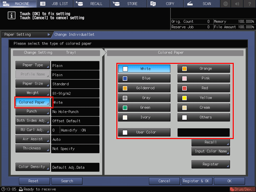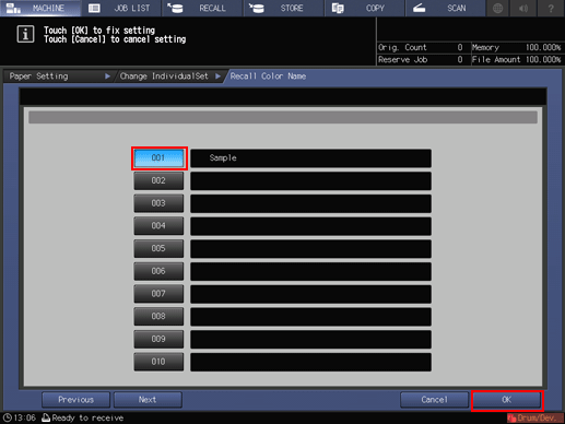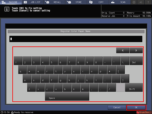 supplementary explanationTo change the specified color name, press Input Color Name to display the Input Colored Paper Name screen and rename it.